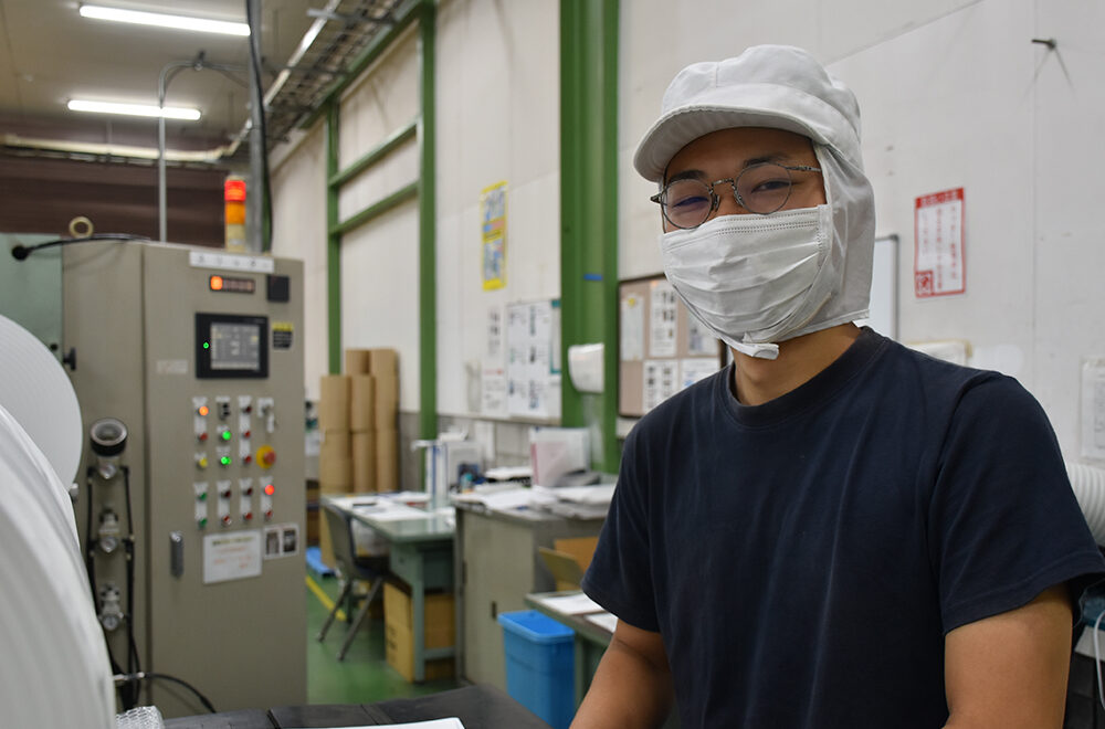 紙おむつの素材となるプラスチックフィルムの製造の場合、フィルム製造が最初の生産工程になります。その後、印刷からカットへとつながるのですが、後工程にて自分の作ったフィルムが良い評価をもらった時は、仕事の楽しさが見いだせます!